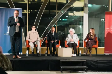 Introduit par Quentin EPRON, vice-président en charge de la vie étudiante et du campus de Melun, cette conférence a rassemblé autour d'Esther SENOT, Yossef MURCIANO, président de l’UEJF, Enzo COHEN, président de l’UEJF Assas, et Fabrice d’ALMEIDA, président du département de sciences de l’information et de la communication, qui a animé l’échange.